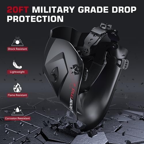 【LONG-LASTING DURABILITY】The auto darkening welding mask was made of high-impact resistant material PA, it features shock resistant and flame Resistant. The helmet meet ANSI Z87.1/ EN379 CE/ CSA Z94.3 compliant. Power by solar cell and CR2450 replacement lithium battery supports long-lasting working time and is quite eco-friendly.