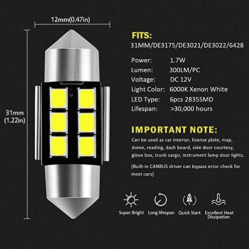 ▼(Set of 6) Working power: 1.7W/PC, Voltage: DC 12V, Lumen: 300LM each bulb, Color: 6000K Xenon White. NOTE: For some Toyot-a vehicle, the 29MM led bulb maybe fit better if the halogen dome lights take DE3175/31MM size bulb.