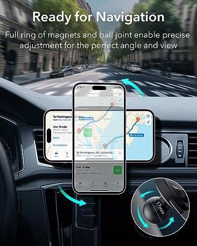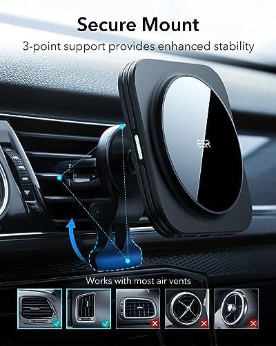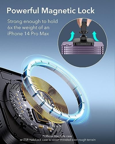 Secure Magnetic Lock: powerful magnets with 1,400 g of holding force and a non-slip silicone ring keep your phone securely in place, even when driving on bumpy roads; an official MagSafe case or ESR HaloLock case is recommended for rough terrain
