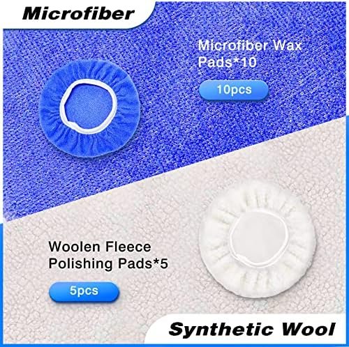 [ 15Pcs Polishing Bonnets ]: 10Pcs blue microfiber wax pads and 5Pcs white Woollen fleece polishing pads, which can adsorb dust and micron particles effectively, achieve waxing, cleaning, and polishing function, soft material, not to hurt the paint.
