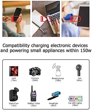 Premium 150w car power inverter: Plug in the car cigarette lighter, offering 150 Watts of continuous 12V DC to 110V AC power output, this car adapter for plug outlet equipped with 2 USB ports and 1 AC outlets, easy charging multi charging devices in the vehicle.