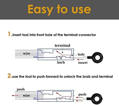 【Easy to Use】 The electric pin remover tool is easy to use, just push and pull the terminal pins with connector removal tool for removal effortlessly from the wire harness connectors without any damage.The O ring handle make it more safe to operate the terminal pins connectors