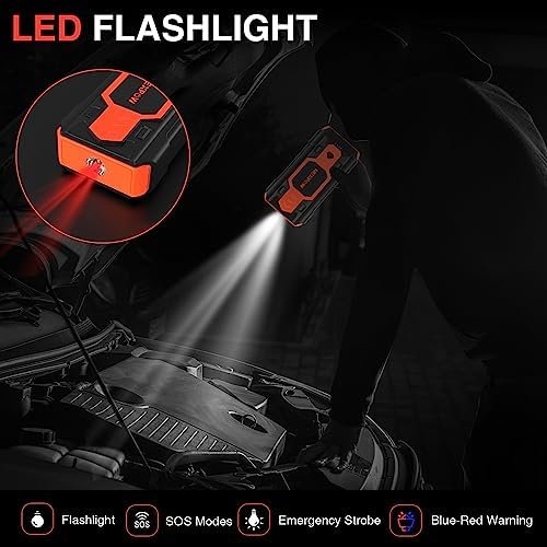 4 LED MODES: Not just a car battery jump starter, the NEXPOW jump starter comes equipped with a very bright LED functioning as an emergency flashlight. The blue-red alternate light can function as a traffic hazard warning signal in the event of an accident. 4 modes (Spotlight/Strobe/SOS) & Red Blue Warning.